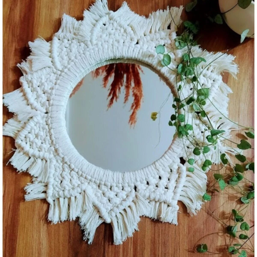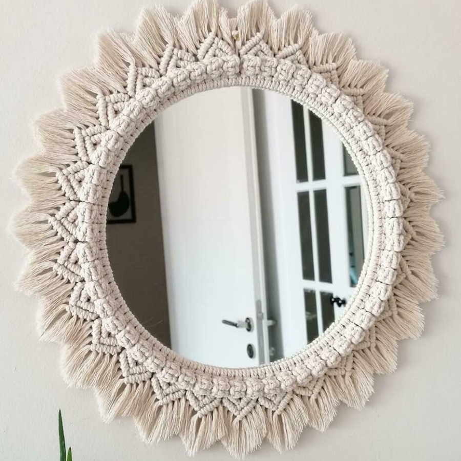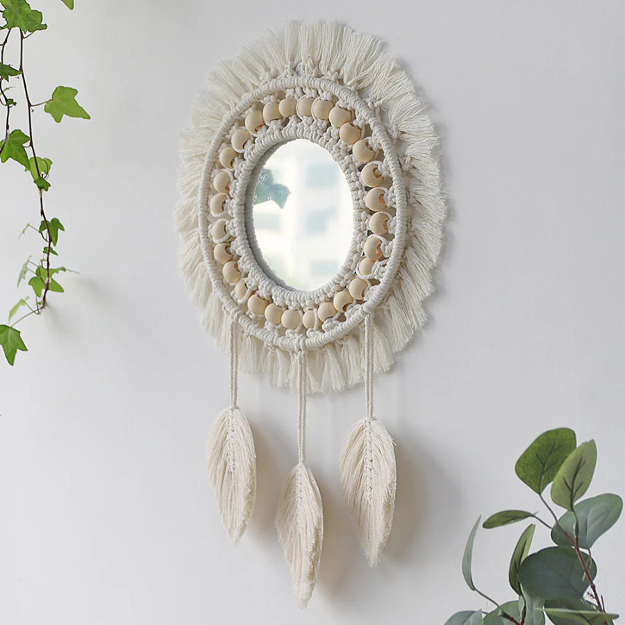 Ahşap Kasnaklı Makrome Bohem Ayna Ekru